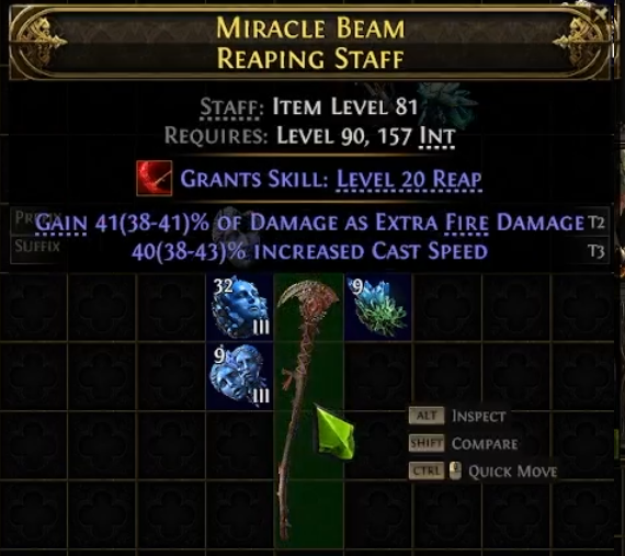 If you hit this and your item has a Prefix as well, put it aside for now or list it for Trade. Just make sure to price check it properly, comparing similar item level Reaping Staves, Magic Rarity with that modifier - you might be surprised at how much it is worth.