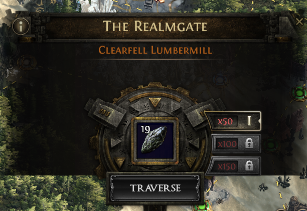 Placing the Splinters in The Realmgate, selecting the Difficulty and number of Simulacrum Splinters to use and clicking "Traverse" will cause a Portal to the Clearfell Lumbermill to open in your Hideout, or Ziggurat Refuge.