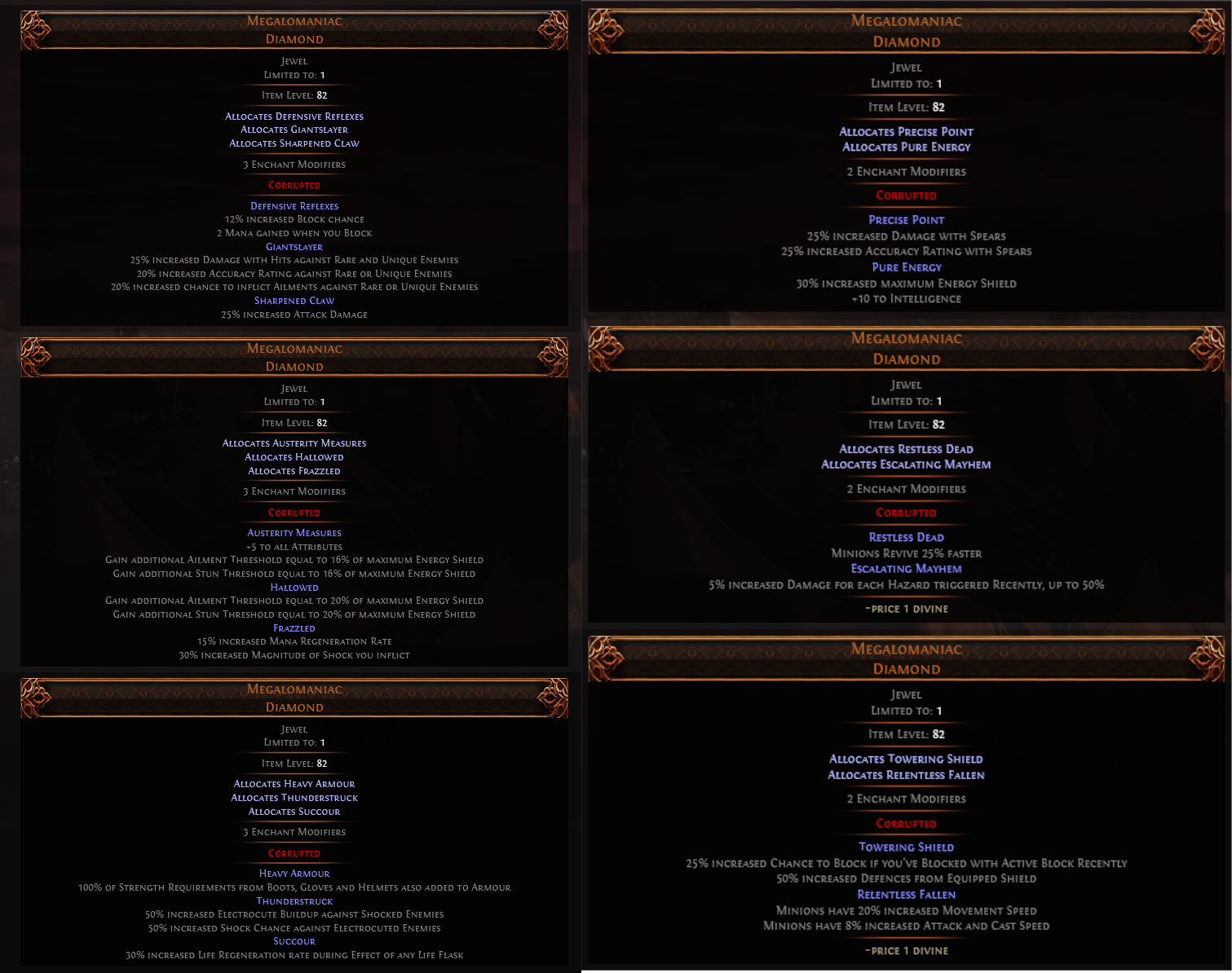 Megalomaniac is a Unique Jewel that can drop in Simulacrum that has either 2 or 3 modifiers that each grant a random Notable Passive Skill Point. These items can vary wildly in value and usefulness depending on the Notable Passives they roll with. Below are some examples of the types of Megalomaniacs that you can find: