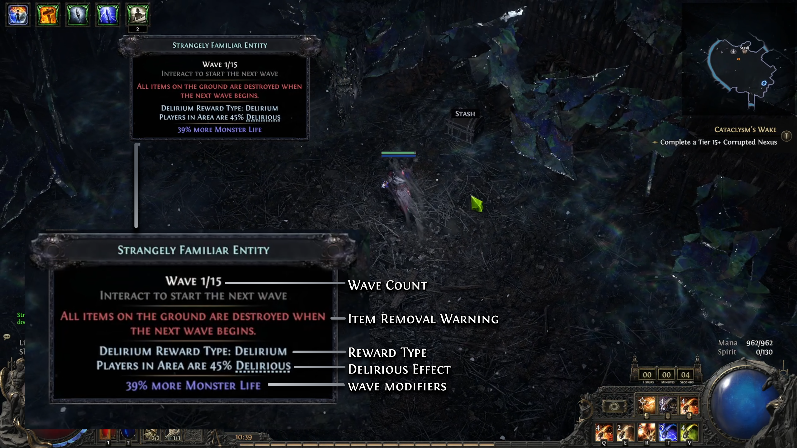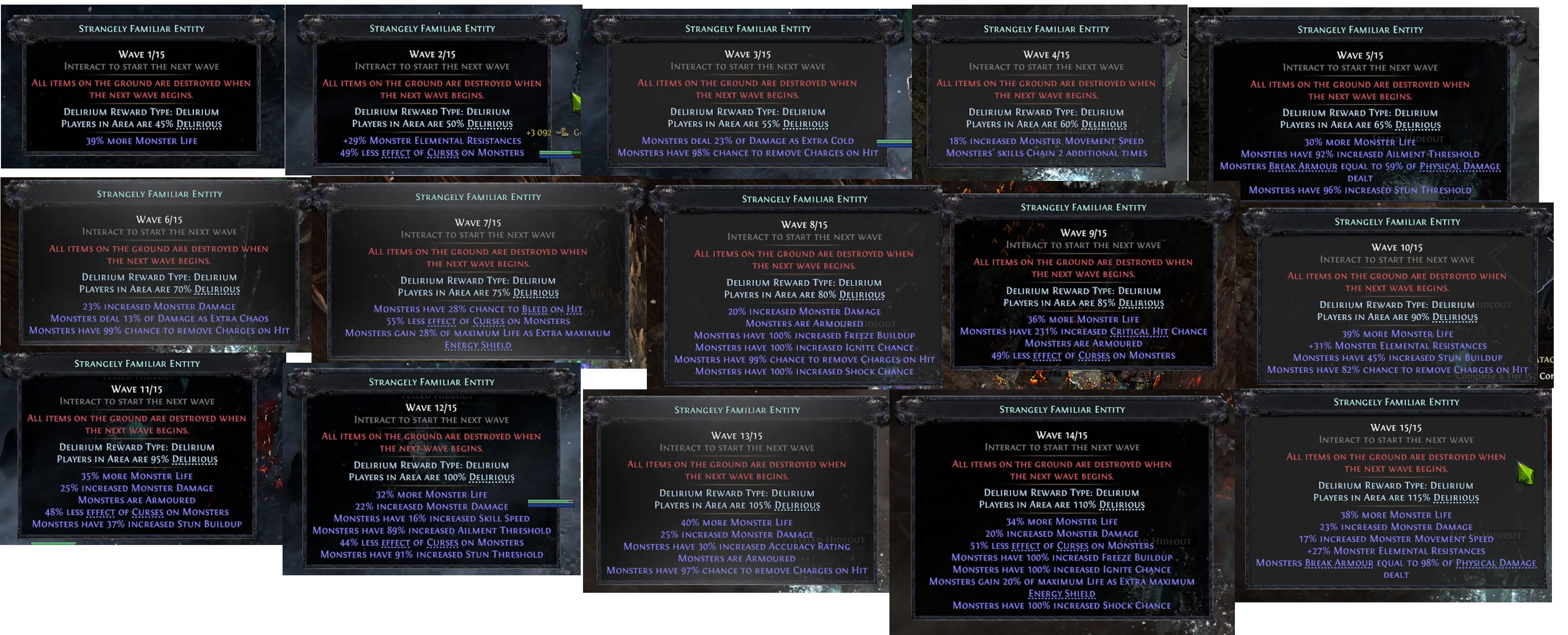 Simulacrums contain up to 15 Waves of increasing difficulty. Each Wave of the Simulacrum will spawn swarms of monsters that need to be slain to fill up the Reward Bar and progress to the next Wave. The higher the Wave level, the higher the Delirious Effect, number of modifiers and monster density.