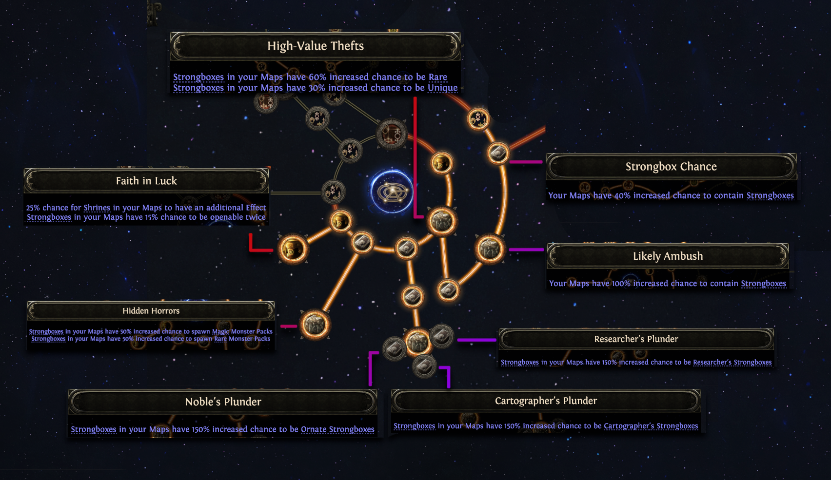 Which Strongbox Atlas Passive Points should you take is up to you, but it makes sense to invest in at least the bottom side of the Tree taking Likely Ambush, High-Value Thefts, and Strongbox Type Selector to improve your chance of finding a Strongbox of a specific type. It is recommended you select Researcher's Plunder as this gives you an increased chance to gain high-value Currency items.