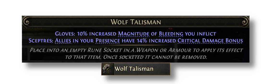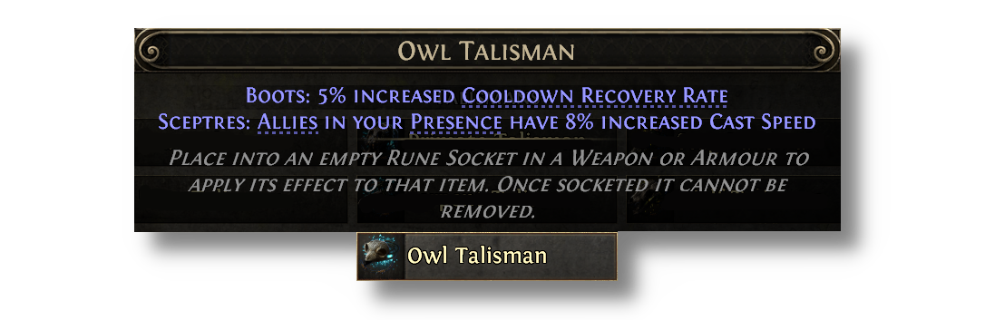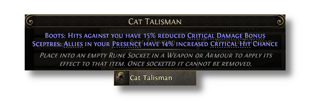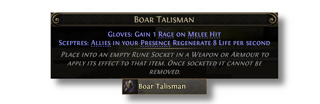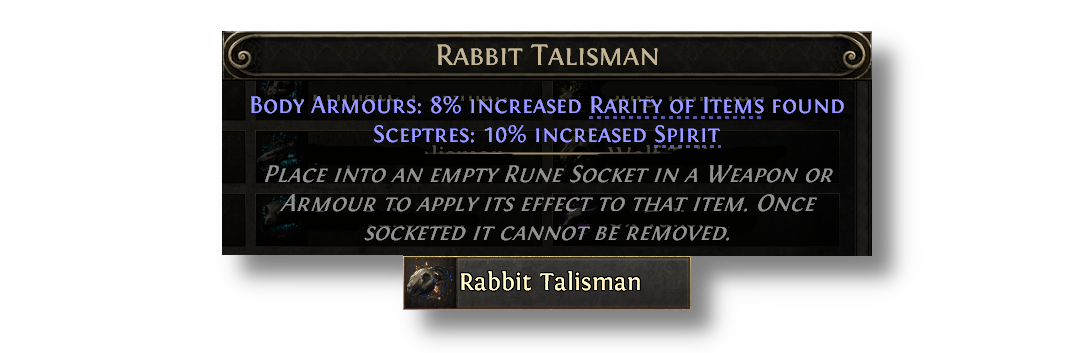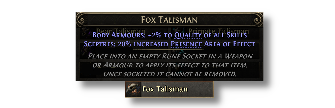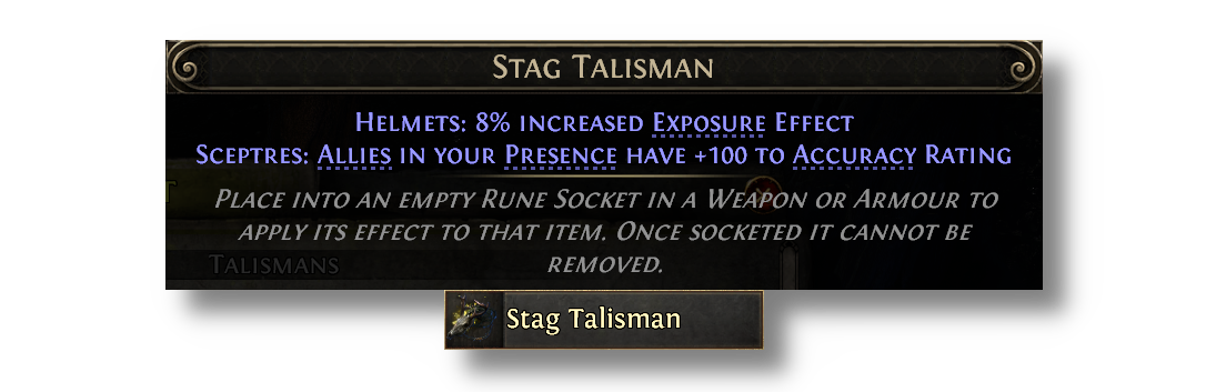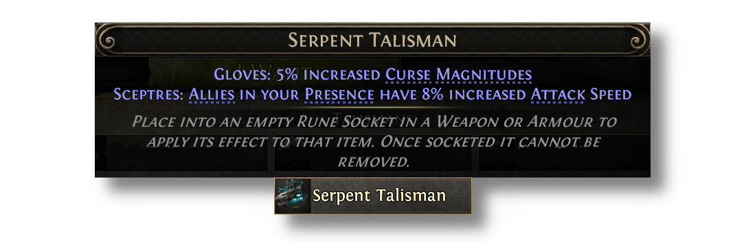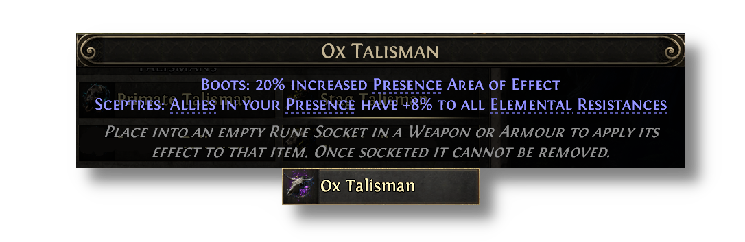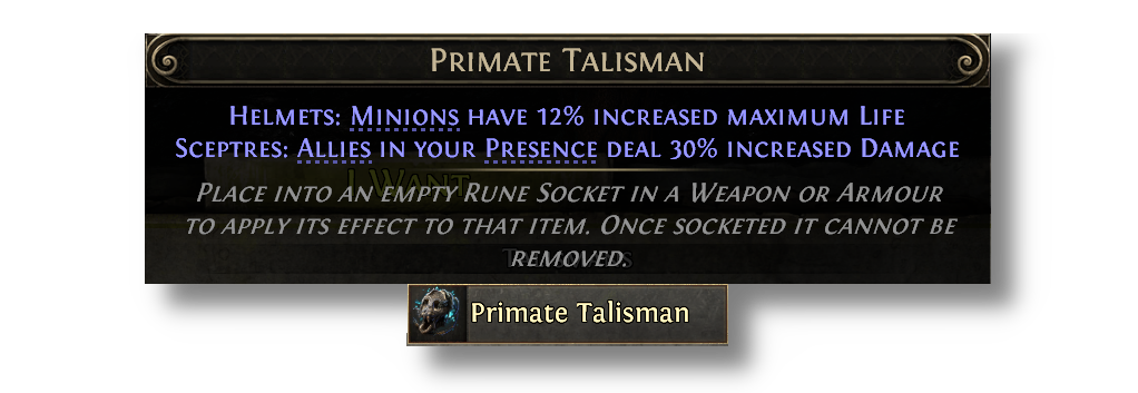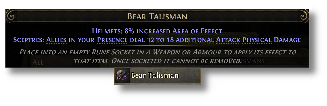 Talismans provide special effects when placed in various armour sockets, but now also have additional minion effects when placed into Sceptres. Talismans can be acquired from slaying monsters affected by an Azmeri Spirit