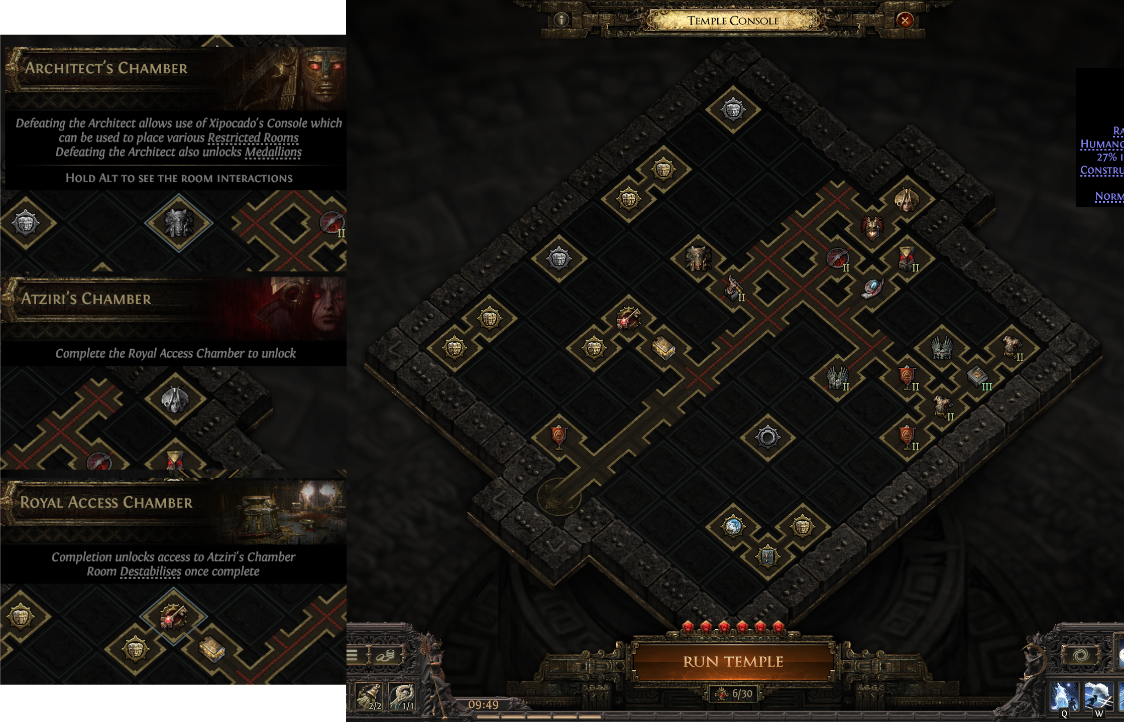 Within the Vaal Temple, players will find the Temple Console which can be clicked to open the Temple Console Window, which includes the Temple grid and a set of Room Cards and Medallions that can be placed to expand the Temple