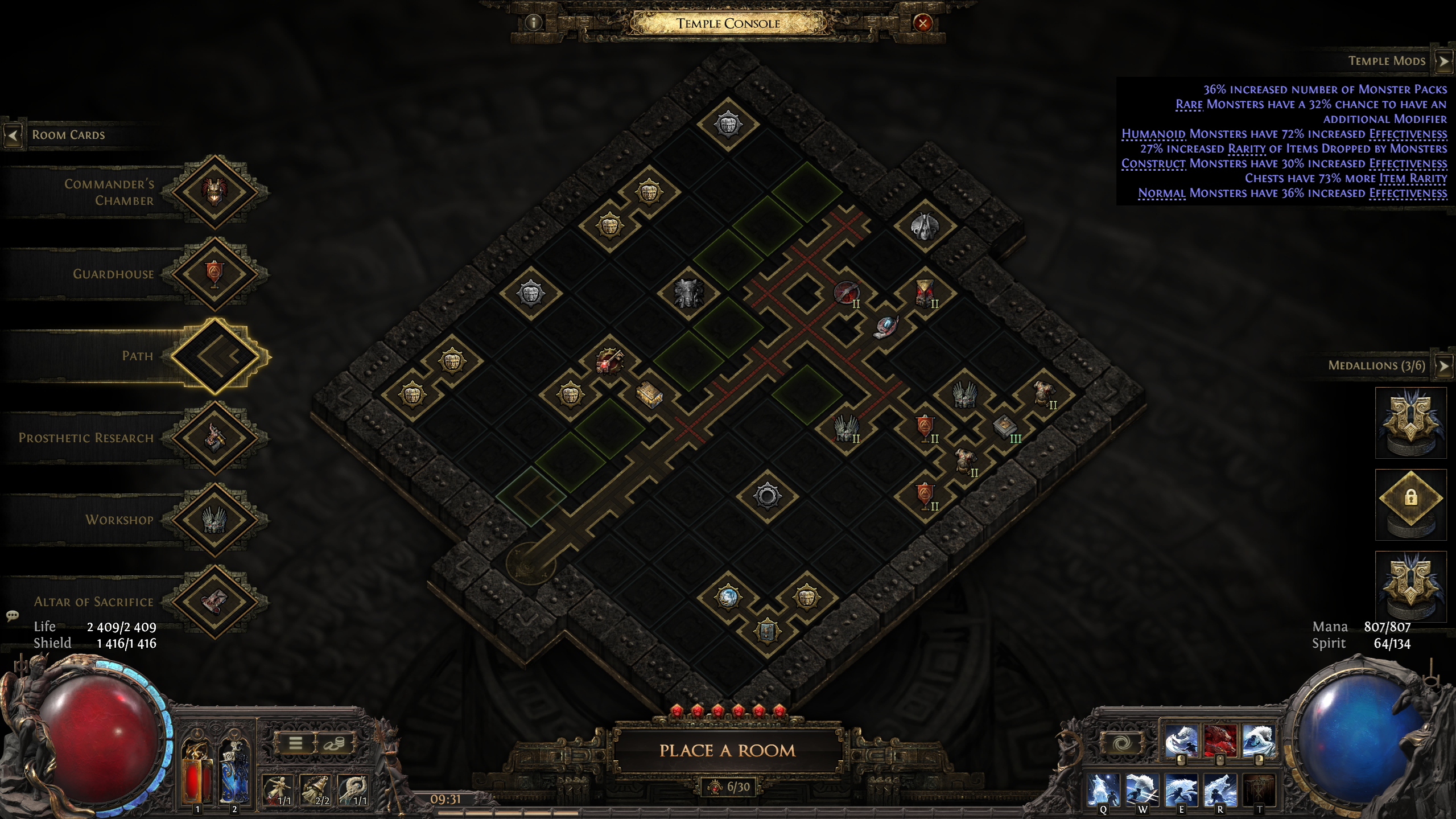 - Temple Mods: At the top right, a list of Temple Modifiers are listed which affects all monsters within the Temple. These modifiers are increased by adding different Rooms to the Temple. For example, a Guardhouse Room (Garrison Tier 1) adds 10% increased number of Monster Packs to the Temple.