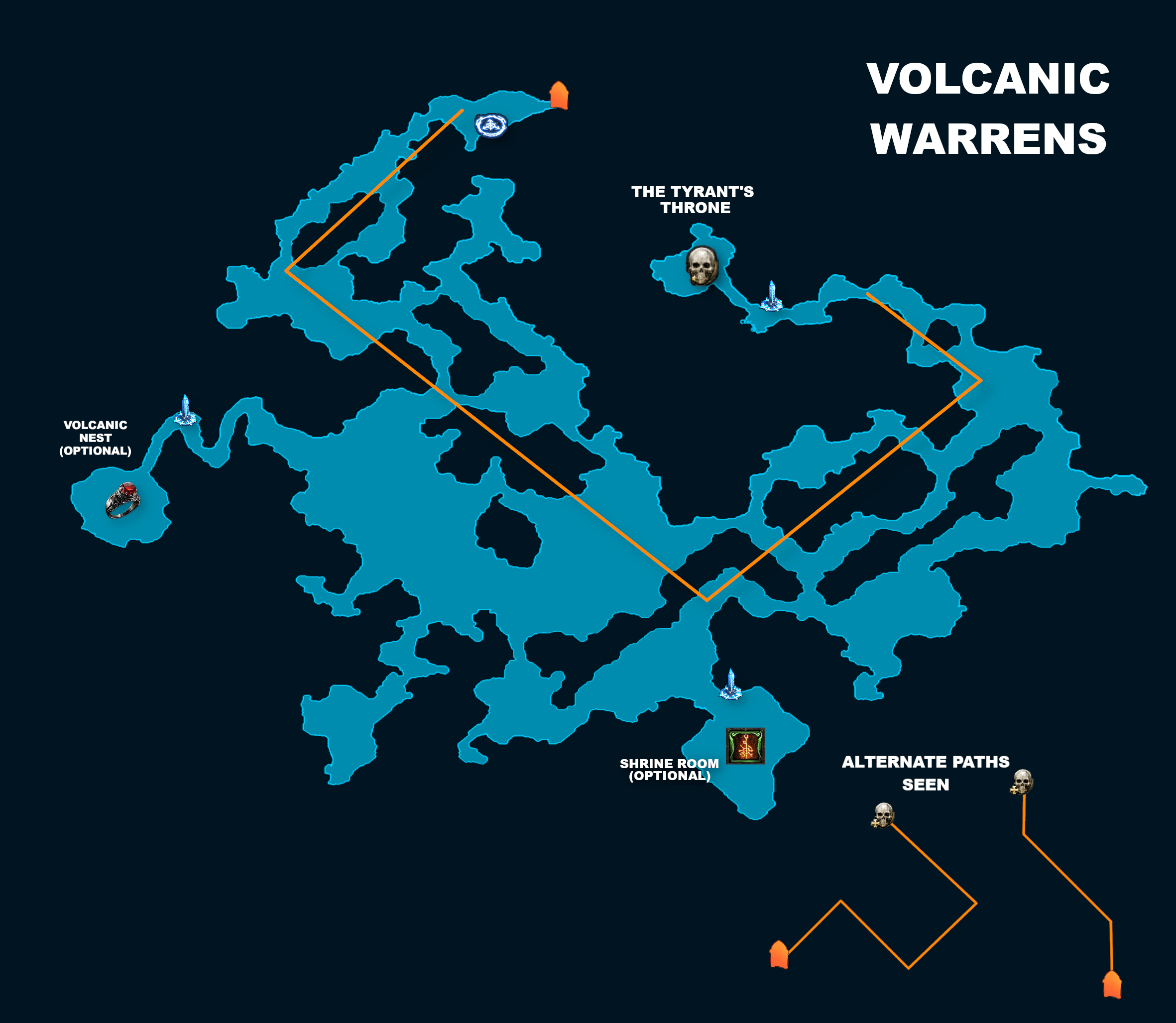 The Volcanic Warrens is a long and winding area, with the Boss spawn on the opposite side of where you enter. This area isn't solved and is fairly easy to get lost in without studying the zone further, but some discovered routes can be seen in the image below