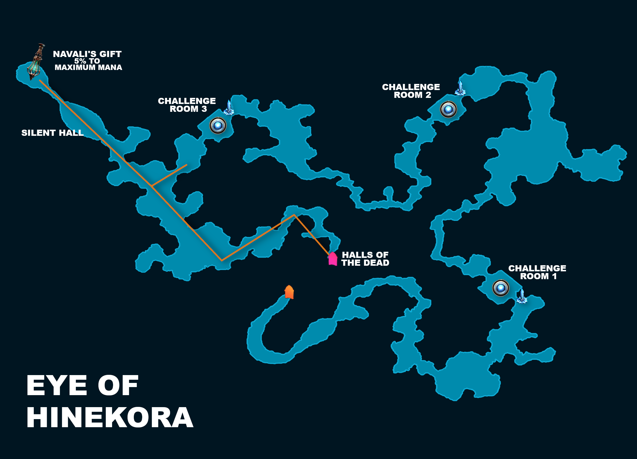 This area is a snake-like funnel in which it is fairly hard to get lost. In this zone, there are three challenge rooms that you must complete to progress. After the third challenge room, the zone will split off in two different directions. The one direction will lead you to The Silent Hall, where you can acquire Navali's Gift for a Permanent Buff that grants 5% to Maximum Mana, and the other direction will lead you to the Halls of the Dead