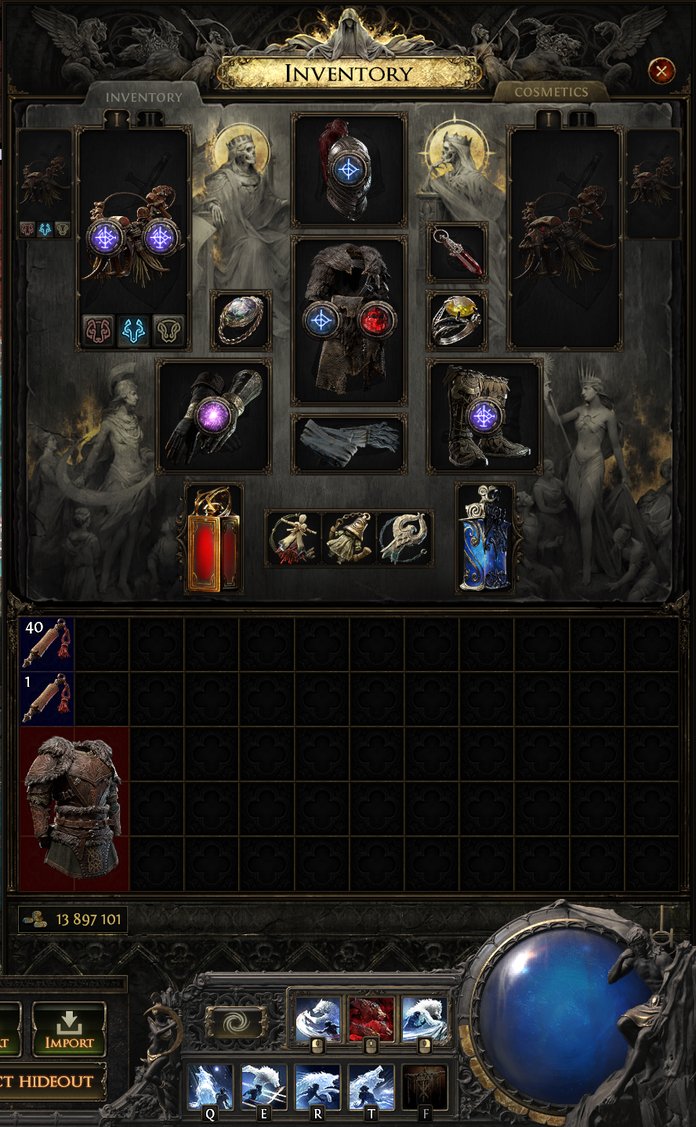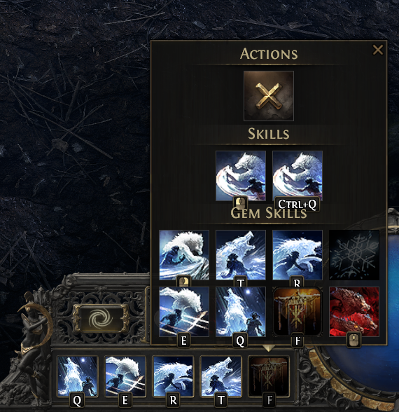- Skill Bar: Displays your currently equipped Skills from items and Skill Gems. You can change these keybinds, but also change which Skill is in which slot by clicking it and selecting the desired Skill