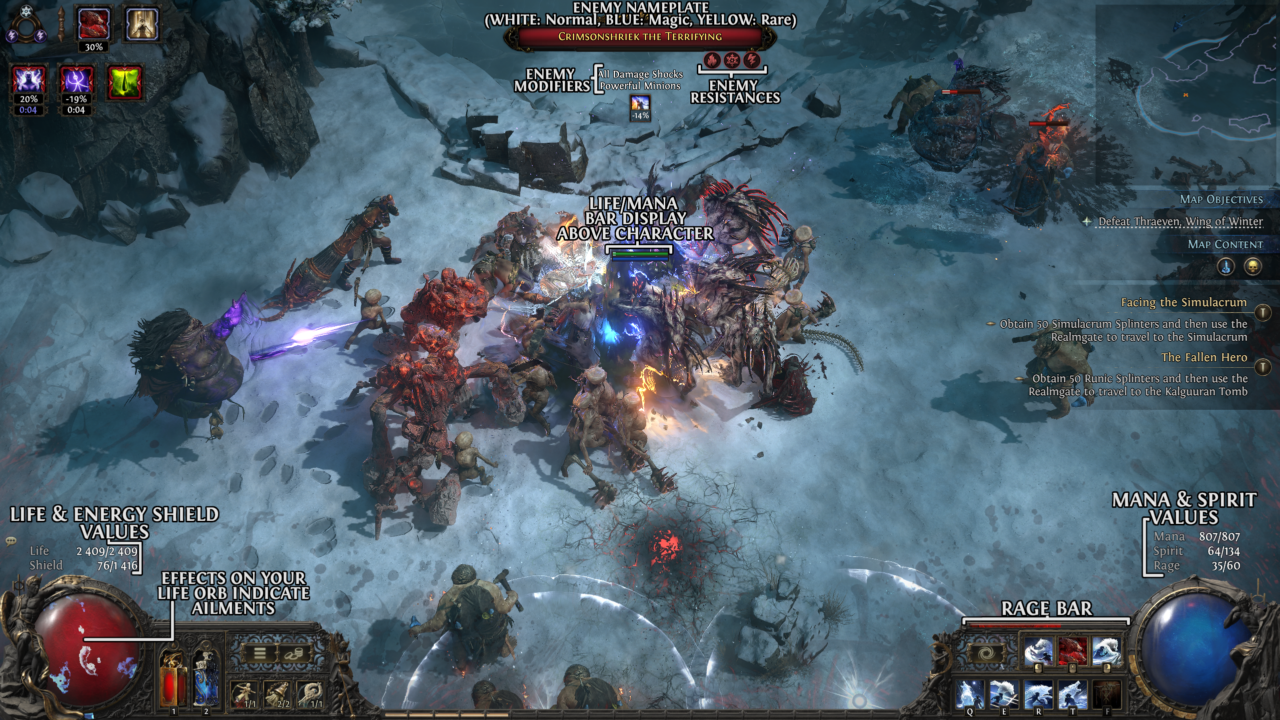 The default UI has many aspects that should be familiar to ARPG players, but each will be explained. The image below can be clicked on to be expanded