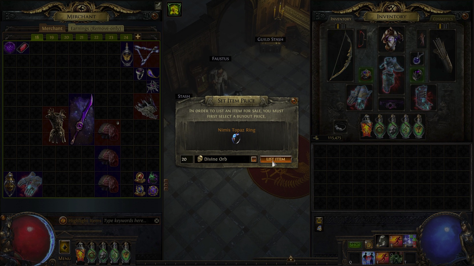 Once a buyer has found your item, they can travel to your hideout at the click of a button and finish the trade without requiring your presence - no need to exit a map, and you can even make sales while you sleep! Simply talk to Faustus to obtain your end of the deal, minus some gold for old Faustus' lunch money, can't have him going hungry now!