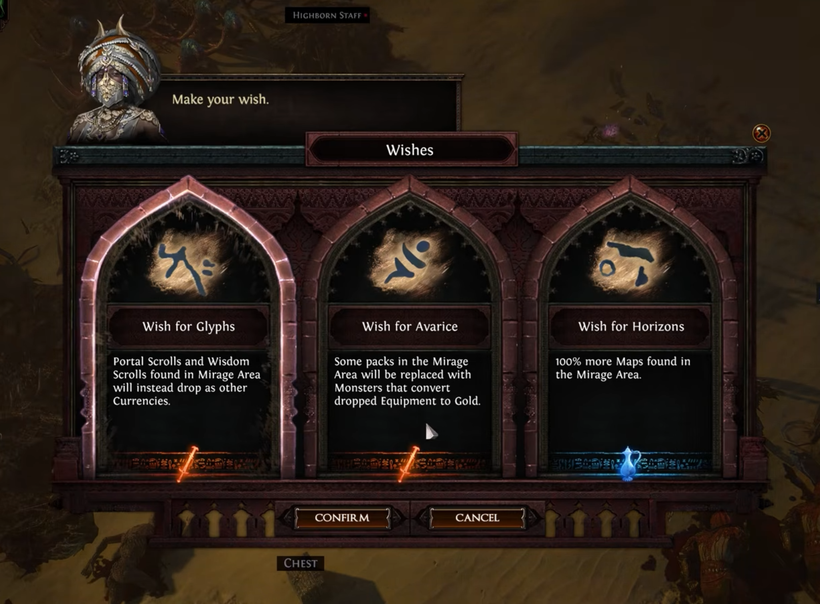 In endgame Maps, before entering a Mirage portal, players will be granted a Wish from Varashta, improving the loot found in those areas, or increasing player power.