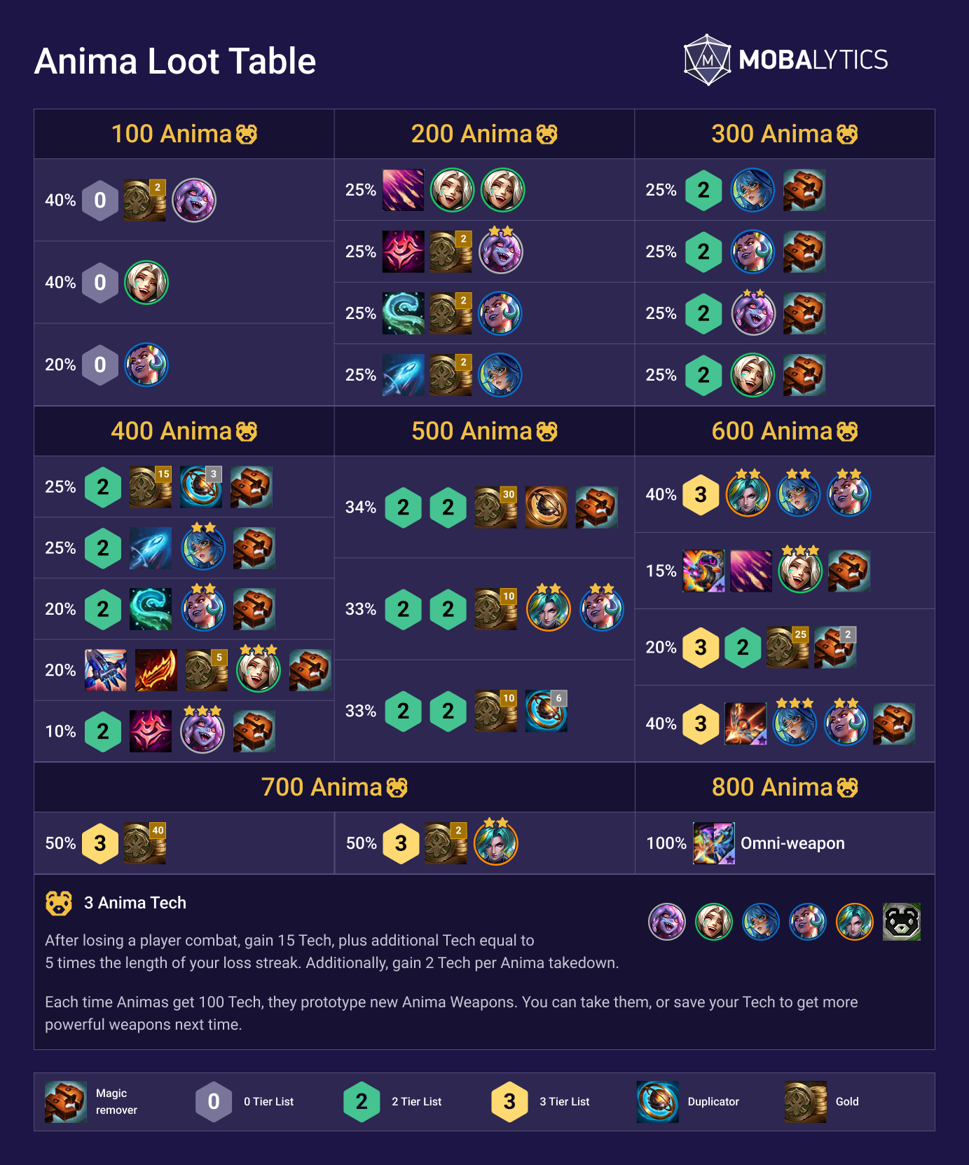 If you’re looking to get ahead of tempo, we recommend aiming for at least 300 Tech, as this gives you a Tier 2 weapon. Hitting 400 is even better, especially for reroll comps, since you still get a Tier 2 weapon while also having a chance to hit Champion Duplicators or upgraded Anima units.