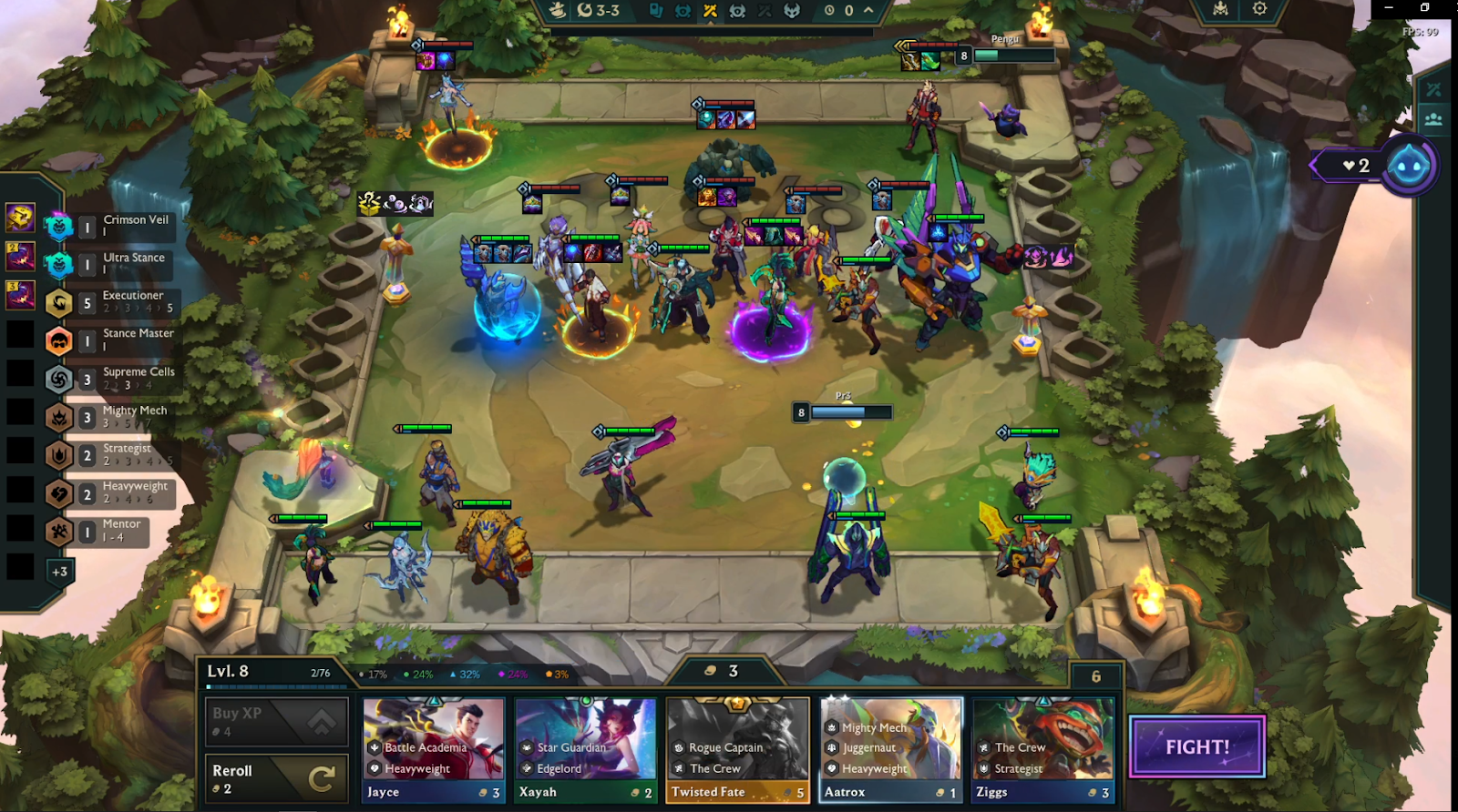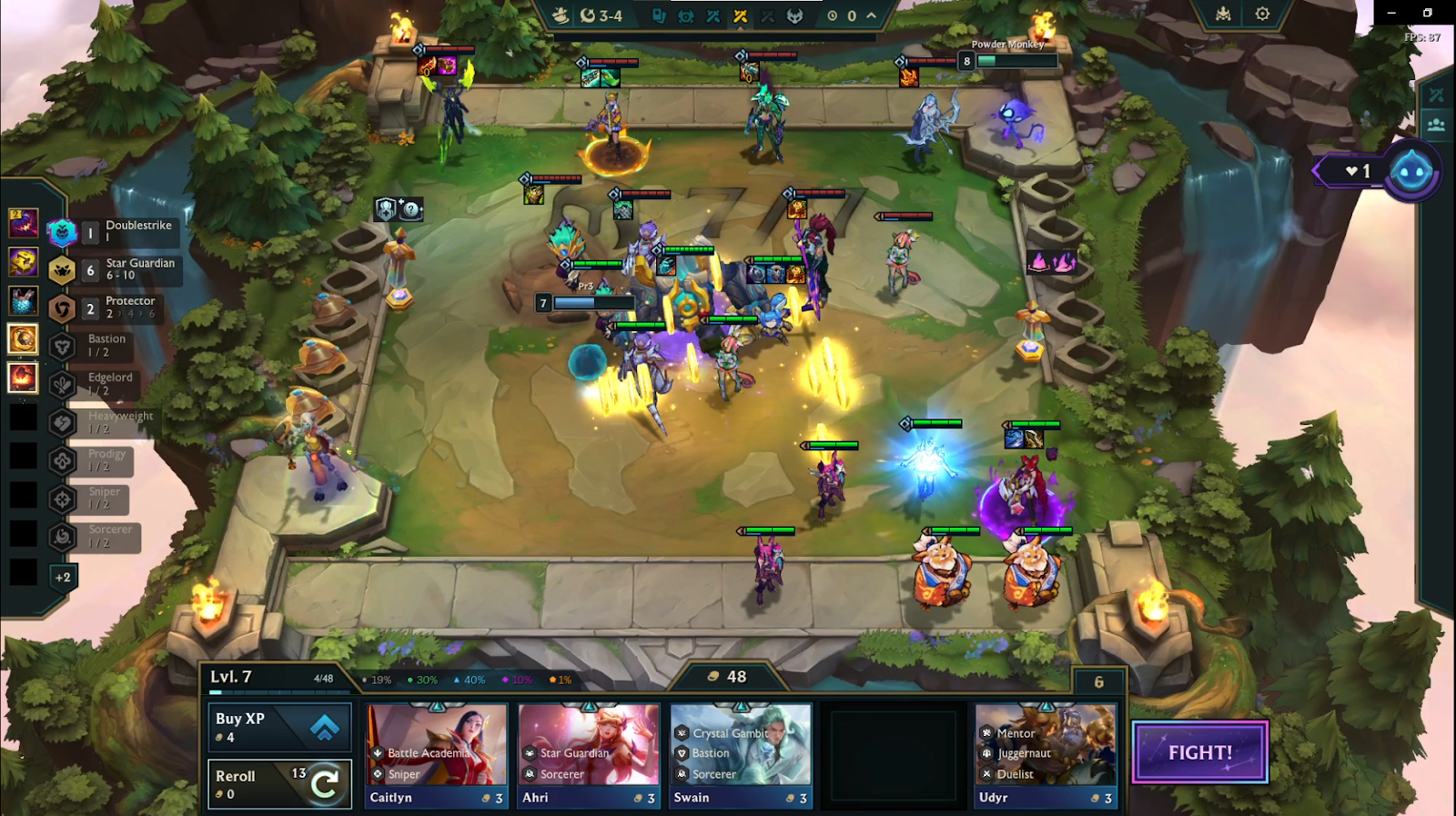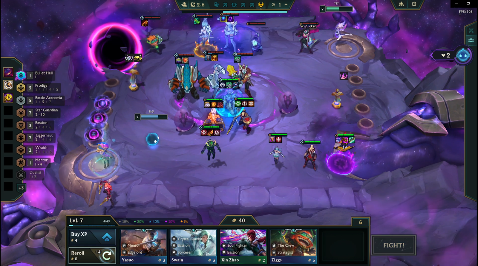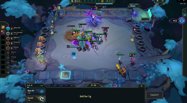 If you have pairs on your bench such as Naafiri or Kalista, It’s worth rolling down to 40 gold in hopes of hitting upgrades. Just make sure multiple units are within Pantheon’s shield radius to get maximum value, then click Fight when you’re ready.