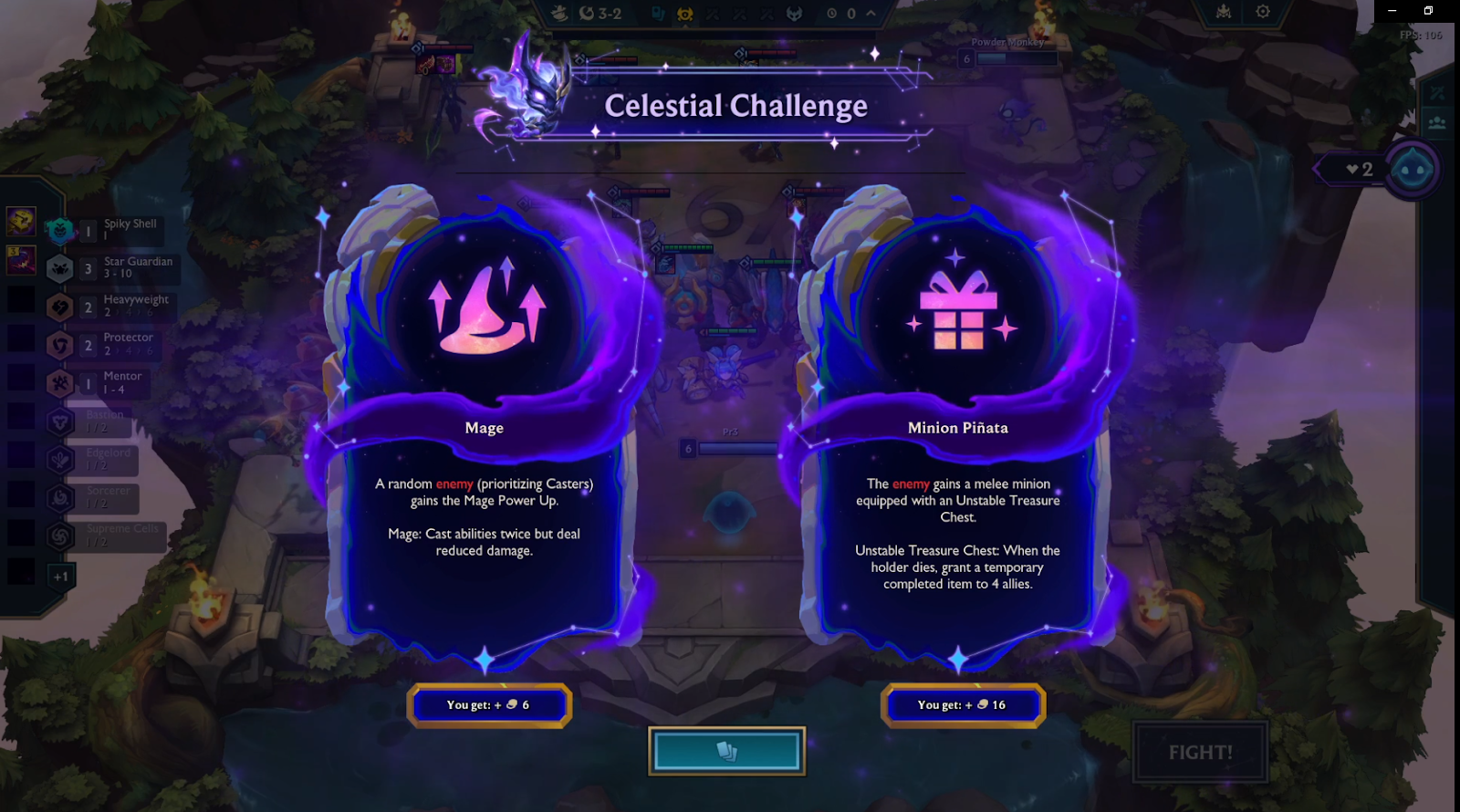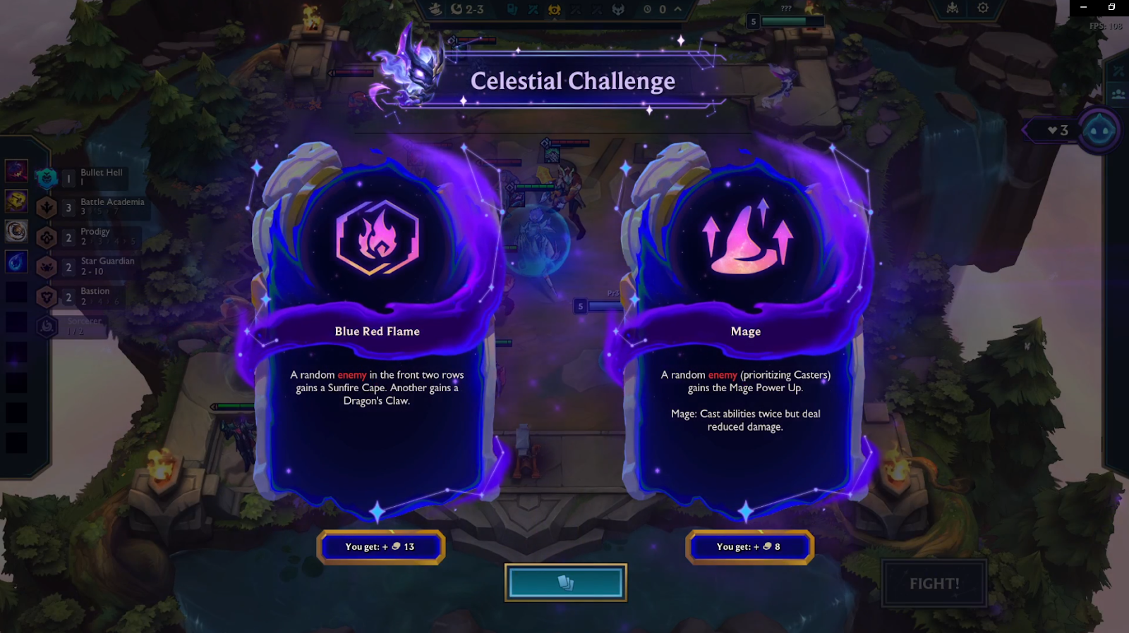 On 3-2 you’ll be offered a Celestial challenge, again we recommend you take in the challenge into account more than the gold given as we’re limited on lifes but if you think you can take the harder one, go for it. Here we take Mage as we have a solid frontline with guardians along with keepers and healing orbs, so we’re certain our frontline can handle the extra spell.