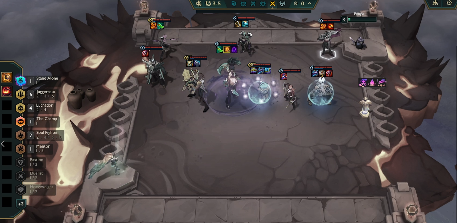 Whichever unit you hit first, K’Sante 2 or Leona 2, you should 3-item them immediately and solo frontline them. At this point, look for power-ups like Stand Alone or Resistant to further boost their survivability. This is what your board should look like by the early part of Stage 3.