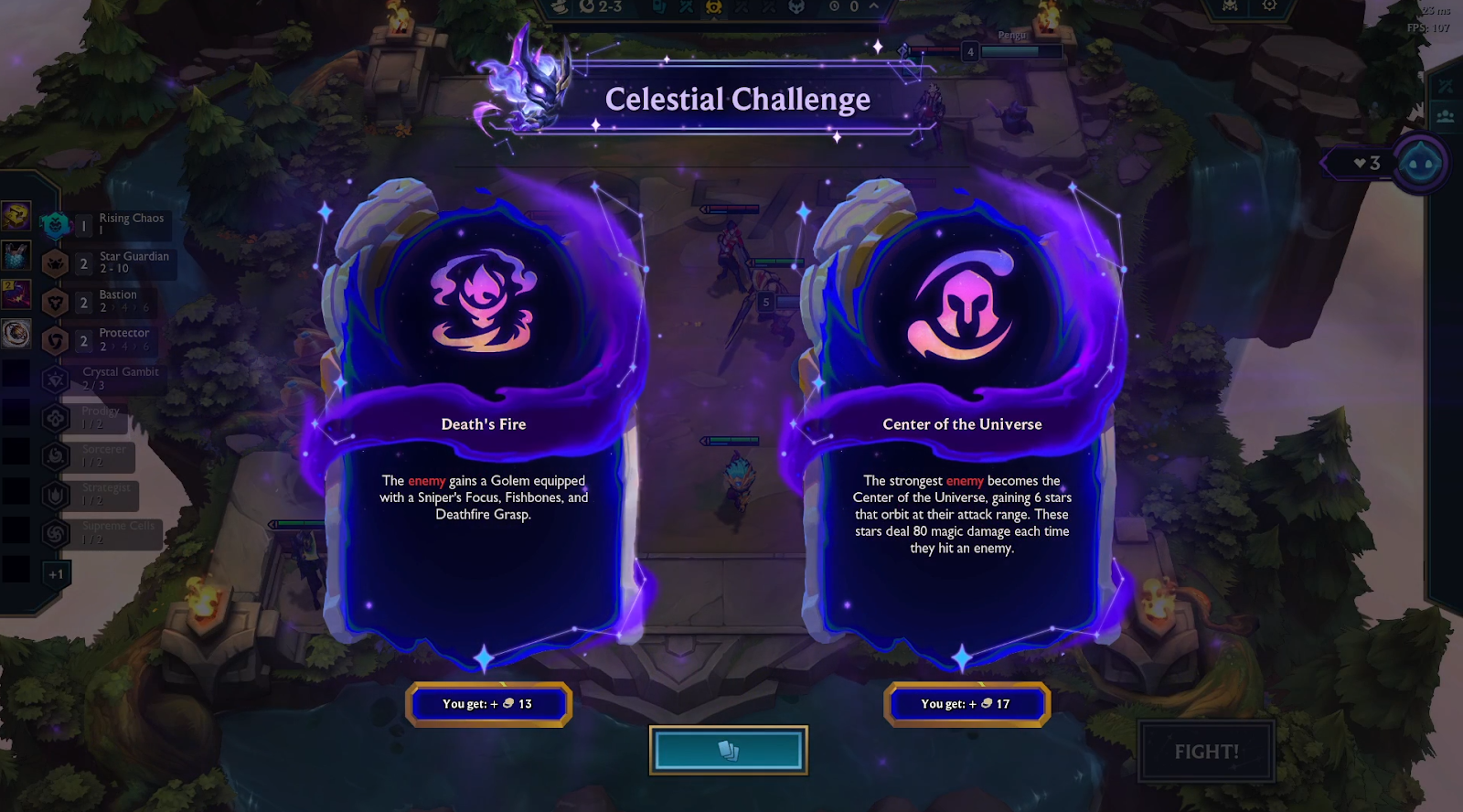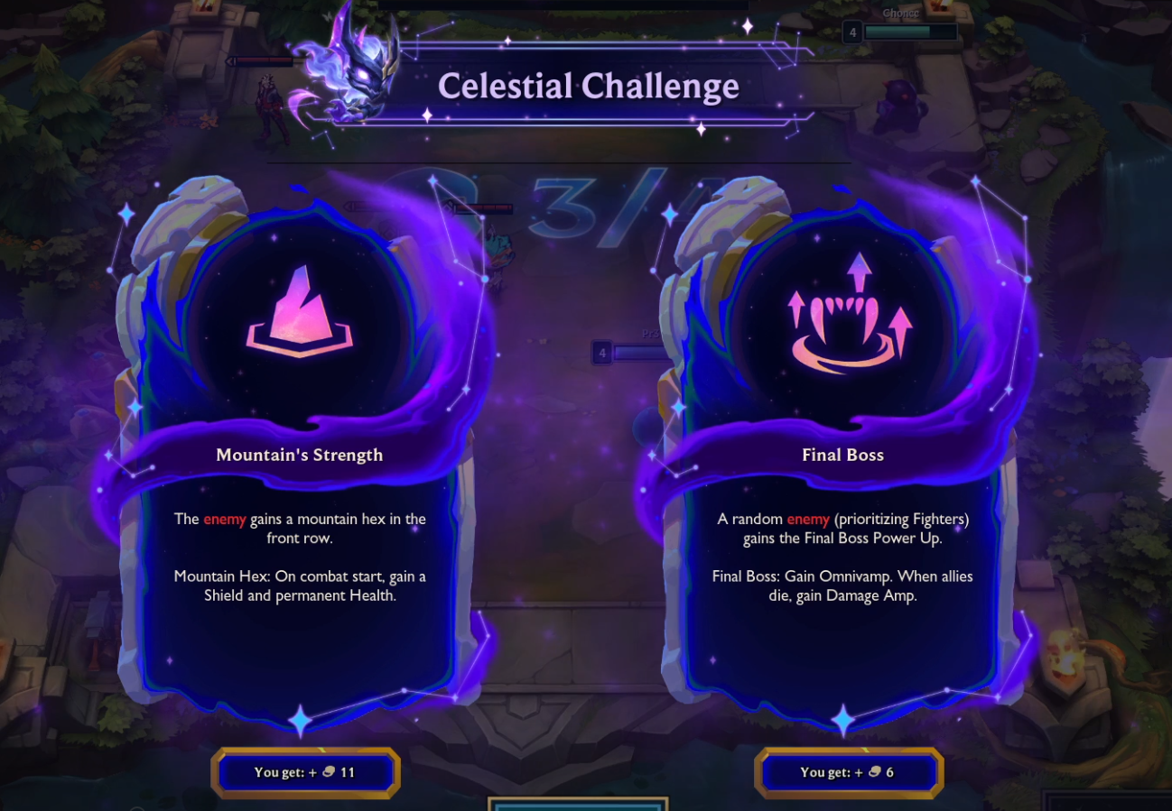 Then we have Celestial Challenges. Think of these as augments for the enemy board. You’ll get to choose between two, but choose wisely, one will be much harder to deal with than the other. But it’s not all bad! In return, you’ll receive a nice gold pay-out to help you build the perfect board to take down the boss and overcome these challenges.