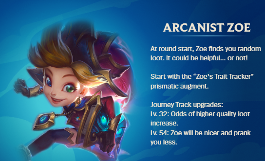 For the Summit, we especially love Arcanist Zoe. You need to be level 54 to unlock her and she'll gives you extra loot and has a lower chance of pranking you. Plus, you'll start the game with the Trait Tracker augment, which challenges you to field 7 active traits in exchange for a bunch of emblems to make the team even stronger, because trust us, you’ll need it.