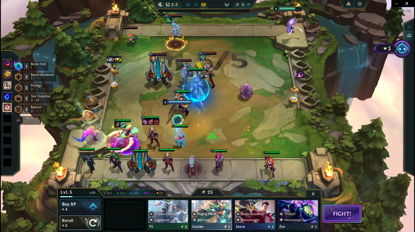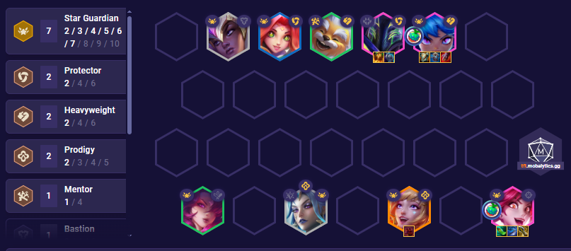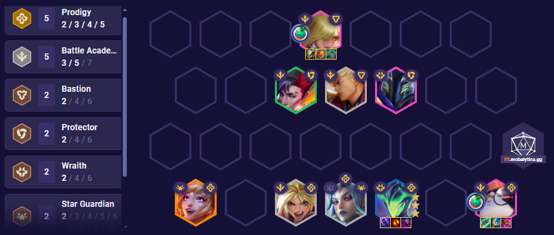 As we’re playing trait tracker you’ll want to start holding units that can activate 7 traits at around level 6 or 7. The good thing about Arcanist Zoe is she can drop emblems also making it extremely easy to cash out trait tracker, by 2-3 we already had a Sorcerer emblem which means while playing Battle academia we can add in Ahri to activate Sorcerer and Star Guardian. A great tip is Mentor units are always good at activating traits, for example if you’re playing Battle academia you can field a Jayce and a Kobuko which will use Heavyweight and a mentor along with Battle Academia with 2 other units.