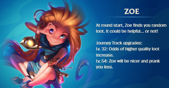 Next is Zoe, your chaotic little helper. She brings you random loot that can be extremely valuable, but beware, sometimes she plays pranks and gives you nothing at all. When upgraded, Zoe becomes insanely powerful pulling emblems, full items, and even units, allowing you to build some of the most capped boards possible. Just don’t get dizzy when you see 20 items in your tab