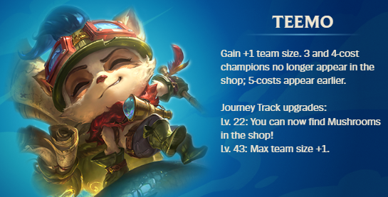 Lastly, we have Teemo, the tiny terror. He gives you +1 team size, removes 3 and 4 cost champions from the shop, and causes 5 costs to appear earlier, perfect for reroll strategies. Upgrade Teemo, and it gets even better: mushrooms will start appearing in your shop, and he’ll grant you another +1 team size