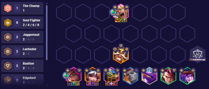 On 3-6 be level 8 and Roll for Sett and Samira while activating 6 Soul Fighter, 8 If you find a Gwen