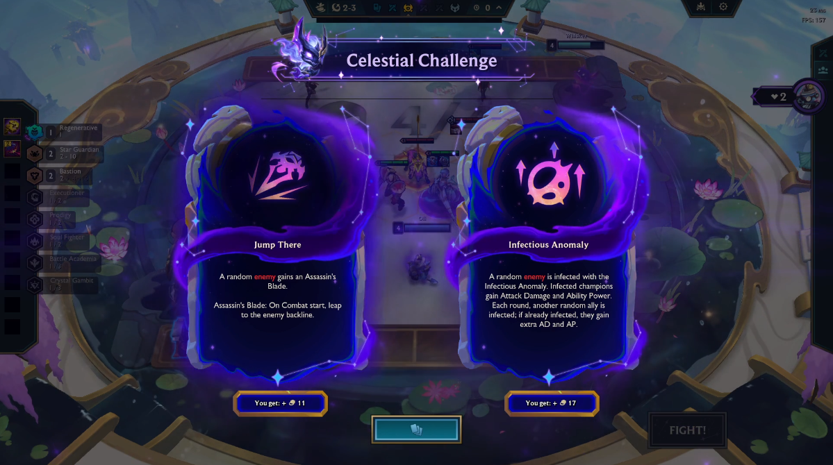 With the first Celestial Challenge being offered, one clearly impacts the game more than the other. Since we're playing around a Fast 8 comp with our main damage dealers in the backline, we don’t want to angle toward Jump In as it forces us to position some frontline units in the back, which weakens our frontline and exposes it unnecessarily. Infectious Anomaly on the other hand, provides more gold and is much easier to play around.