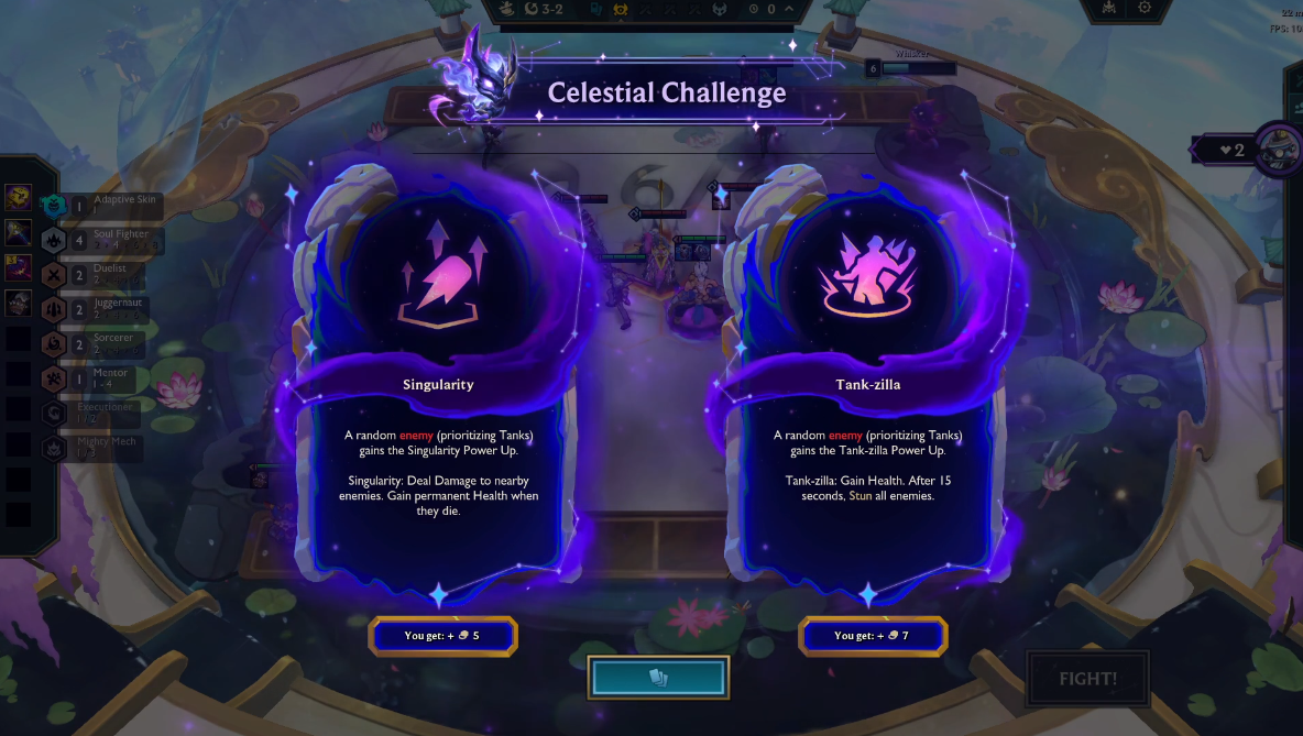 After completing the boss fight, you'll be offered the final Celestial Challenge of this stage on 3-2. Singularity is usually the better pick here. The permanent health option isn’t very impactful this late in the stage, and Tank-Zilla is just straight up a harder challenge to play against as the whole board getting stunned late into the team fight can really change the way the fight goes.