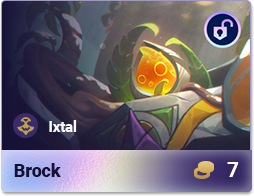 Next up is Brock, an insanely strong Krug with tons of crowd control and damage. Brock is probably the rarest 7-cost unit you’ll encounter this set, as unlocking him requires a total of 500 Ixtal Clues. This is really only manageable with an Ixtal opener on 2-1 and completing multiple quests to reach that 500 threshold. If you do start with an Ixtal opener, pick quests you can realistically complete and work your way up to the magic 500. Some augments can help, like Calculated Loss, which benefits you from losing, or Titanic Titan, which gives you the HP to survive a few extra rounds for quest progress.