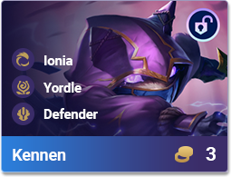 Back to the Yordles, and we have the 3-cost Ninja himself, Kennen. He can be unlocked by reaching a certain number of star levels within specific traits. You’ll need a total of 8 star levels in either Ionia, Yordle, or Defender. So whichever route you choose, having four 2-cost units from one of those traits will give you the required 8 star levels, causing Kennen to appear in your next shop.