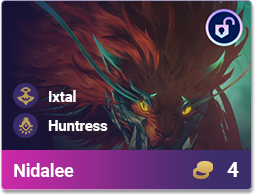 We have our first unlockable Ixtal unit, the 4-cost Hunter Nidalee. She is unlocked by fielding two 2-star Neekos in combat for one round. Ideally, if you’re planning to play around Nidalee, you’ll want to 3-star Neeko anyway, since her Huntress trait makes her untargetable as long as your strongest Neeko is alive. If you’re committing to an Ixtal line, look for augments like Heroic Grab Bag, which help you work toward a 3-star Neeko or you might even get Champion Duplicators from your Ixtal cash out.
