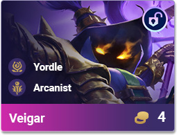 For our next unlockable champion, we have Veigar. To unlock him, you need to field a unit holding two Rabadon’s Deathcaps for one round. So if you’re committing to playing Yordles in the early game, keep in mind that you’ll want to save your Rods to build the Deathcaps needed to bring out this tiny master of evil. If you don’t get enough Rods from PvE rounds or carousels, you can look for augments such as Pandora’s Items or Wand Overflow to help you complete the items.