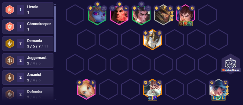 In this comp, you’ll be looking to reroll Demacia units. The main carries are Sona and Jarvan, and once you have both at 3-star, the goal is to push levels to activate Galio and play around 7 Demacia.