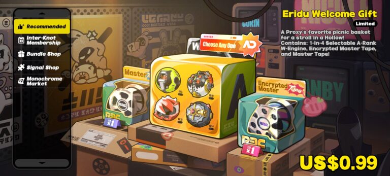 Next up we have the “New Player Bundle,” or Eridu Welcome Gift. For only $1, you get a Master Tape, Encrypted Master Tape, and an A-Rank W-Engine Selector.