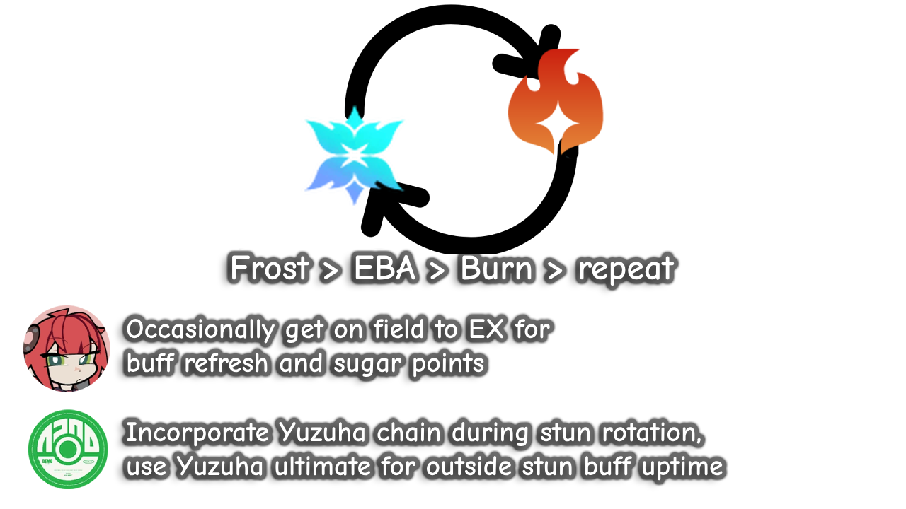 Pompey is not a freezable enemy, so there is not a lot of Stun rotation optimization that we can do. The best that I can pull off on the stun rotation is 2 EBA and 4 Disorder inside stun. I find that using Miyabi ultimate right before stun, and not inside stun feels a lot better. The ultimate timing for the team is basically ASAP, using Miyabi and Burnice ultimate outside stun helps a lot on conserving their resorce for keeping the disorder chain goign